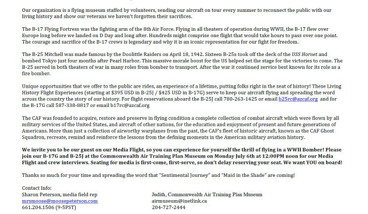 WWII History Takes Flight * On Saturday, July 11th the Commonwealth Air Training Plan Museum’s Tiger Moth, Harvard, Stinson and a Cornell, will fly and be available for an up close and personal look. * Check out our newest addition a Fleet Finch aircraft, a primary trainer of WWII. * Sentimental Journey, the B-17 Flying Fortress and Mitchell B-25 will also fly as well as a WWII A-26 Invader, a Korean War T-28 Trojan and several other planes. * The Flying Demonstration will commence between 3 and 4 pm, weather permitting. * Aerobatics by Stefan Trischuk of Discovery Channel “Airshow” Admission is $10, children free (17 & under) when accompanied