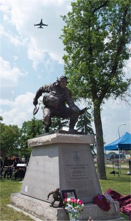 The RCAF WWII British Commonwealth Air Training Program Memorial Commonwealth Air Training Plan Museum ~ Brandon, MB, Canada "The unveiling of the Royal Canadian Air Force (RCAF) Second World War British Commonwealth Air Training Program Memorial took place on September 10, 2014 in Brandon, Manitoba. It pays tribute to the brave airmen and airwomen of the British Commonwealth who lost their lives during the Second World War. The memorial is impressive in both size and scope. It has a 100 metre long row of black granite panels etched with 19,256 names, a 2.5 metre tall bronze statue of an airman and 1,150 square metres of paving stone, including a 20-metre wide RCAF wing in full colour." |