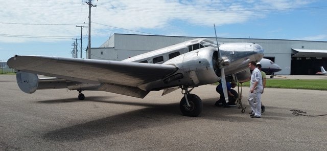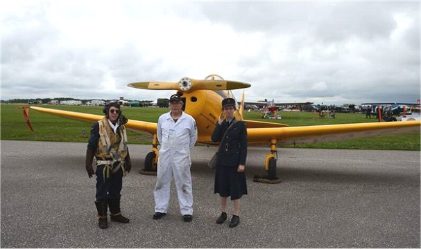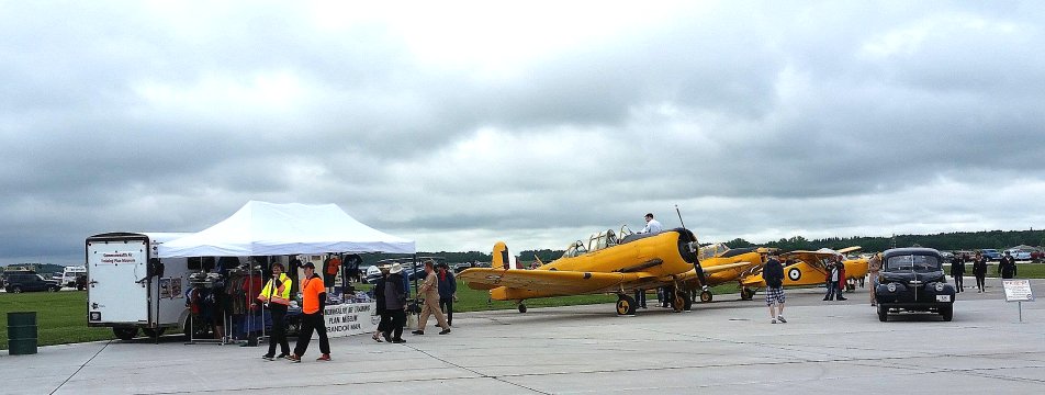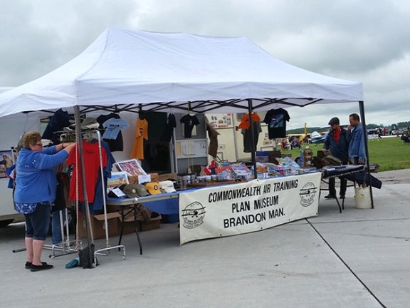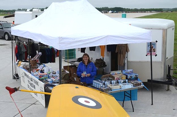 We took a well-stocked trailer of items from the Museums Gift Shop and set up shop on the "cold ramp" beside the 1940 Harvard MKIIa, 1943 Cornell and the 1940 Stinson HW75. Grant Shaw brought the 1940 Chevy Staff car on display and we used it to shuttle our volunteers to and from the gate. ~ John McNarry